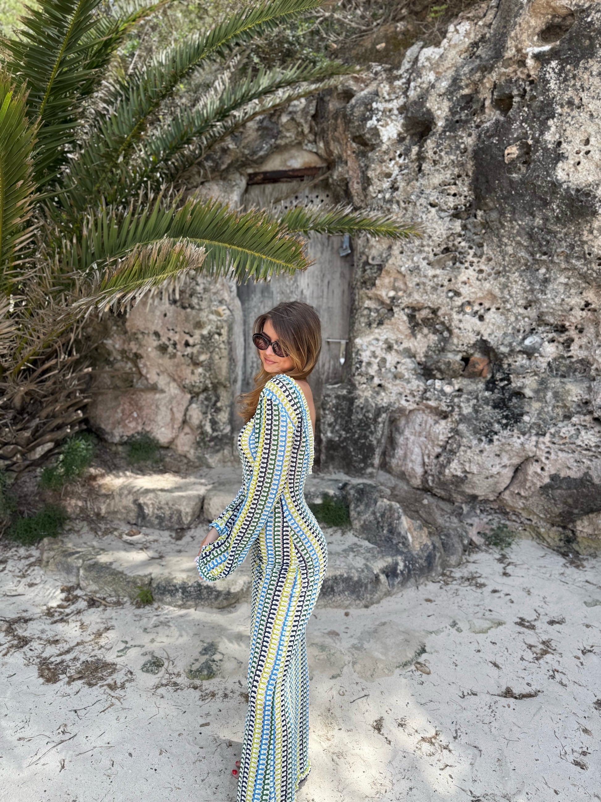 Avec son dos nu élégant et sa maille ajourée aux teintes solaires, ISLA est la robe iconique des escapades ensoleillées. 🩵 Sa coupe près du corps et ses manches longues bouffantes lui apportent une touche bohème irrésistible. On craque pour son motif façon crochet et ses couleurs fraîches 🐚💛